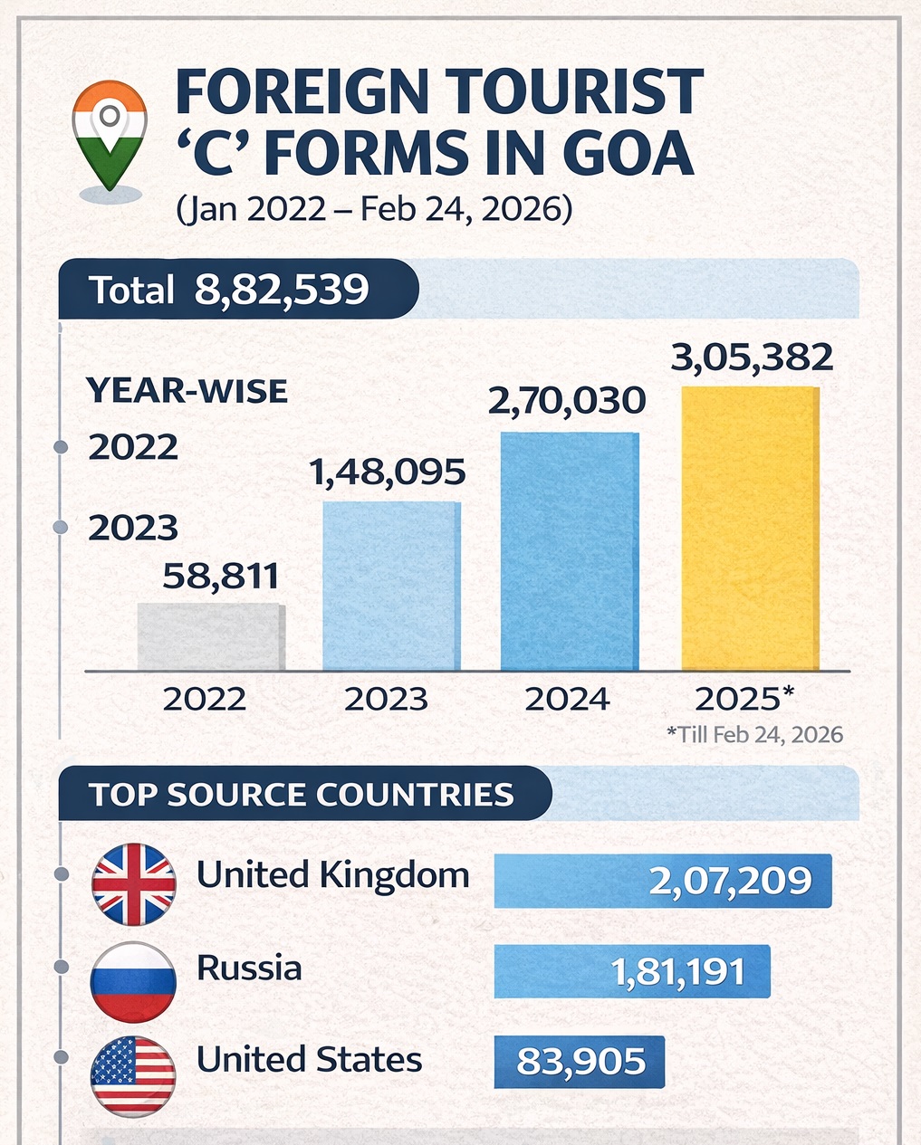 As per the data placed before the Goa Legislative Assembly on Monday, Chief Minister and Home Minister Pramod Sawant informed the House that 8,82,539 ‘C’ Forms — mandatory documents submitted by hotels and accommodation providers to record the stay of foreign nationals — were uploaded between January 2022 and February 24, 2026.
