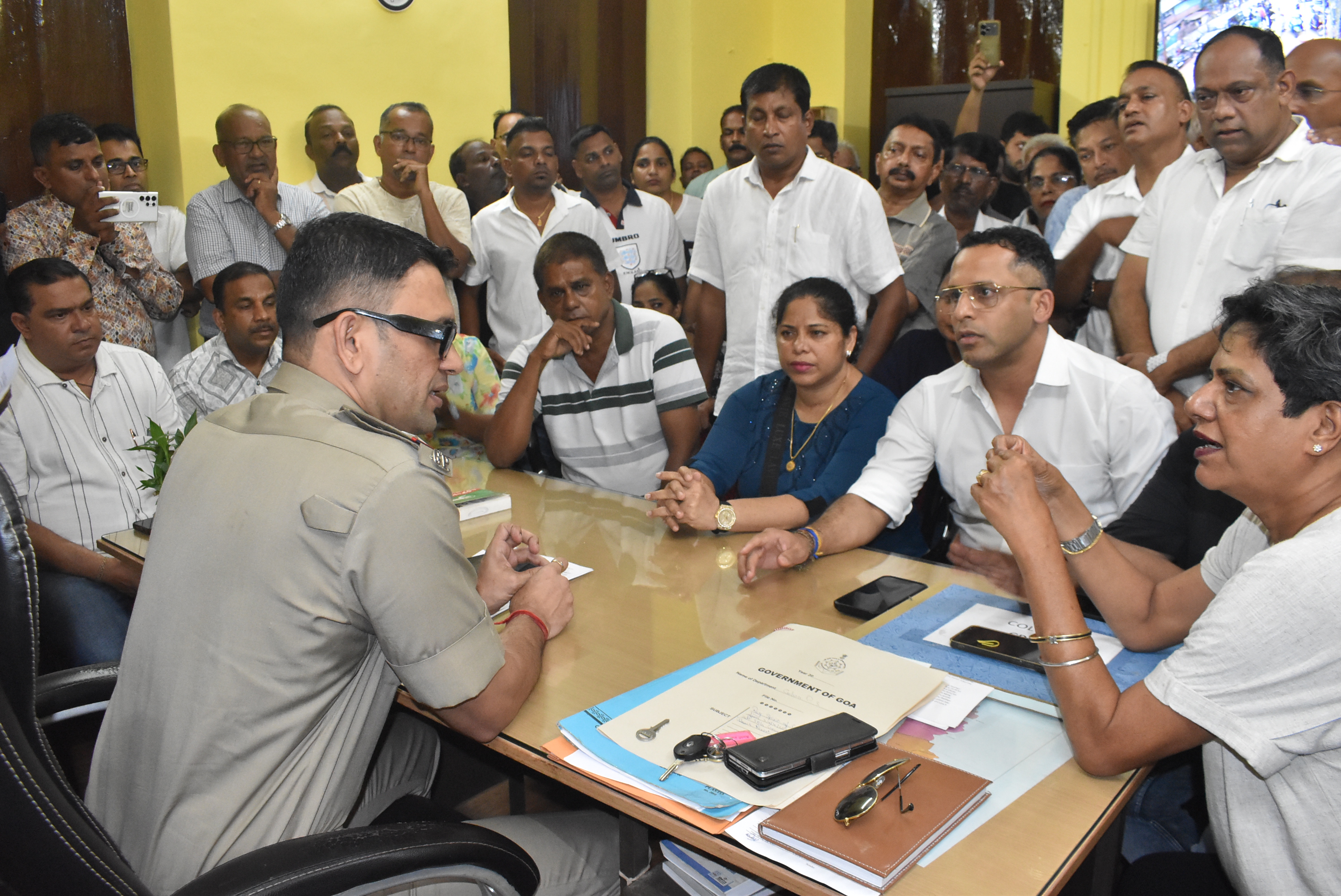 Citizens from Salcete coastal belt at the Colva police station on Monday evening demanding action against the accused for derogatory remarks against St Francis Xavier. A delegation of local elected representatives with Colva PI Vikram Naik demanding actio
