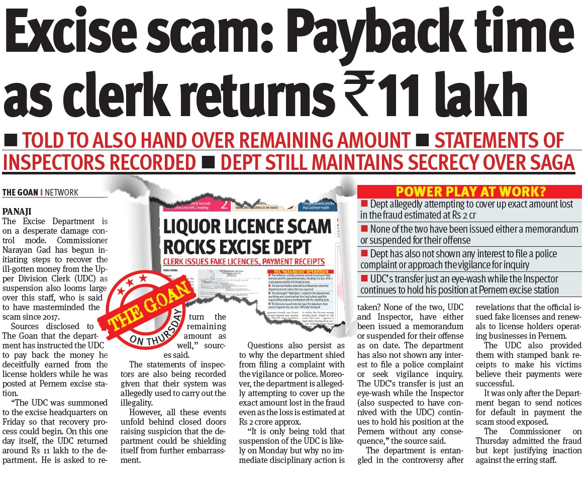 Reliable sources disclosed to The Goan that the department has instructed the UDC to pay back the money he deceitfully earned from the license holders while he was posted at Pernem excise station.