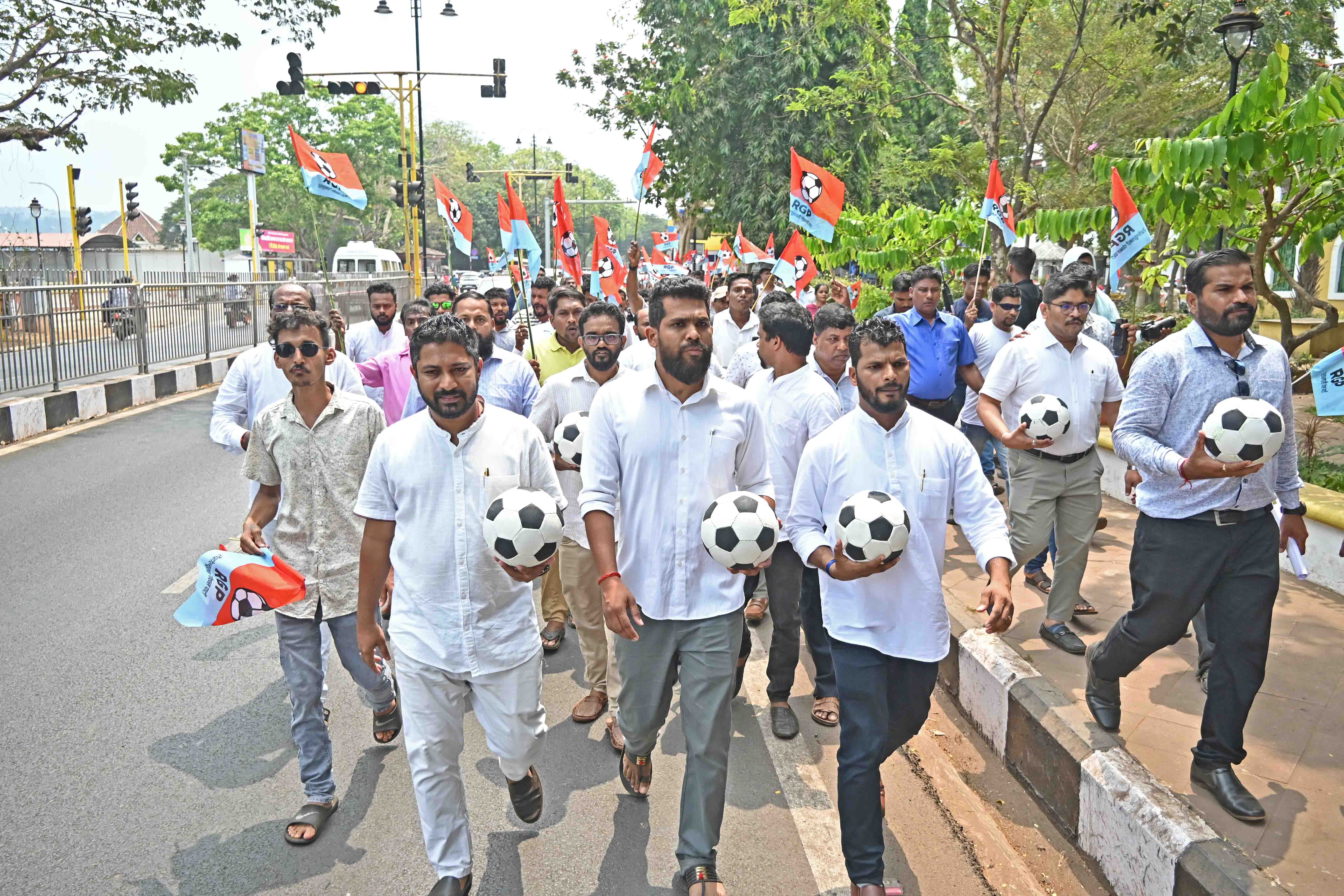 Earlier, Parab led a large group of his supporters waving party flags and several of them holding footballs, which is the party’s symbol, as they marched towards the Collectorate building in the capital city in a show of strength.