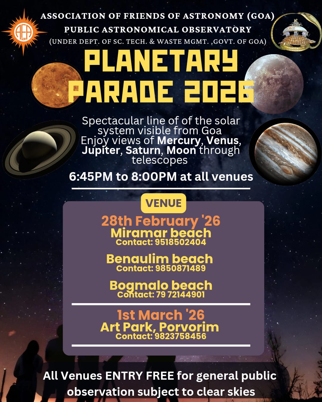 Public observation sessions will be held at Miramar, Bogmalo, and Benaulim beaches on February 28, and at Art Park, Porvorim, on March 1. All programs run from 6.45 pm to 8.00 pm. Entry is free, and no prior registration is required.